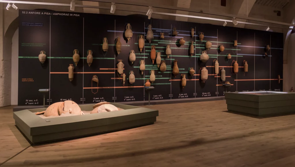 Tra gli scavi sono state trovate grandi imbarcazioni da carico provenienti da porti lontani, piccoli scafi adatti alla navigazione nelle acque di fiume e una innumerevole quantità di reperti da cui si intuisce quante merci provenienti dai quattro angoli del Mediterraneo passassero da Pisa. Sono stati ritrovati anche oggetti della vita di bordo dei marinai e dei passeggeri, per esempio cassette per i medici, giochi da intrattenimento durante la navigazione, resti di un giubbotto in pelle, stoviglie e tutto il necessario per la cambusa; una passerella di legno, una grande ancora con un pesce angelo scolpito come portafortuna. Ad oggi nel museo sono esposti circa 800 reperti.