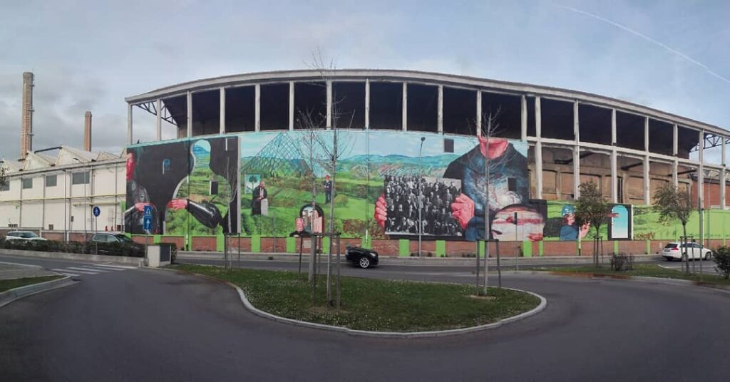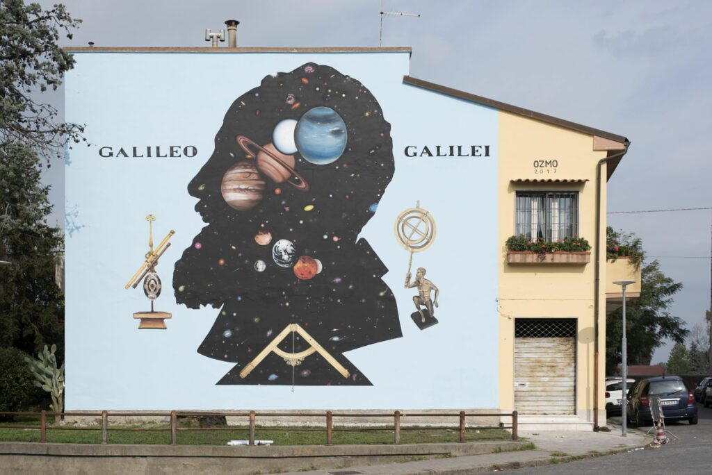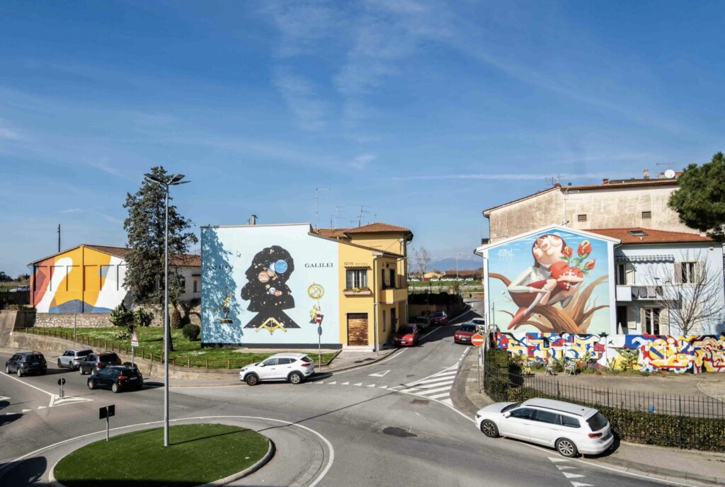 Il percorso del museo a cielo aperto continua subito dopo con il grande murale di Kobra intitolato “Connessioni” e ispirato alle scoperte di Galileo Galilei e alla scienza. Si tratta di un’opera realizzata dall’artista brasiliano nel 2023 e con gli oltre 160 metri quadri di superficie è tra i murales più grandi di Italia.