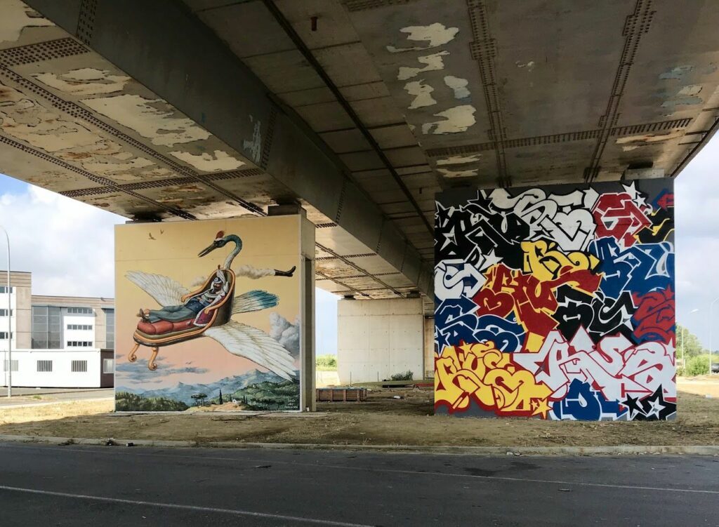 Anche i piloni della strada di grande comunicazione Firenze-Pisa-Livorno sono diventati oggetto di interventi artistici e il completamento dei murales a cura di Etnik e Zed1 al Deposito della Polizia Idraulica di Pisa è stata l’ultima tappa (per ora) di un ampio progetto di rigenerazione urbana.