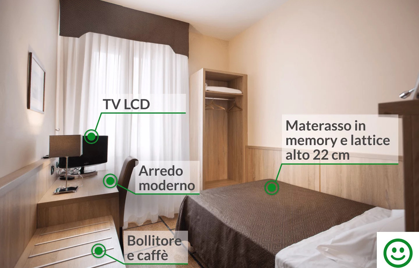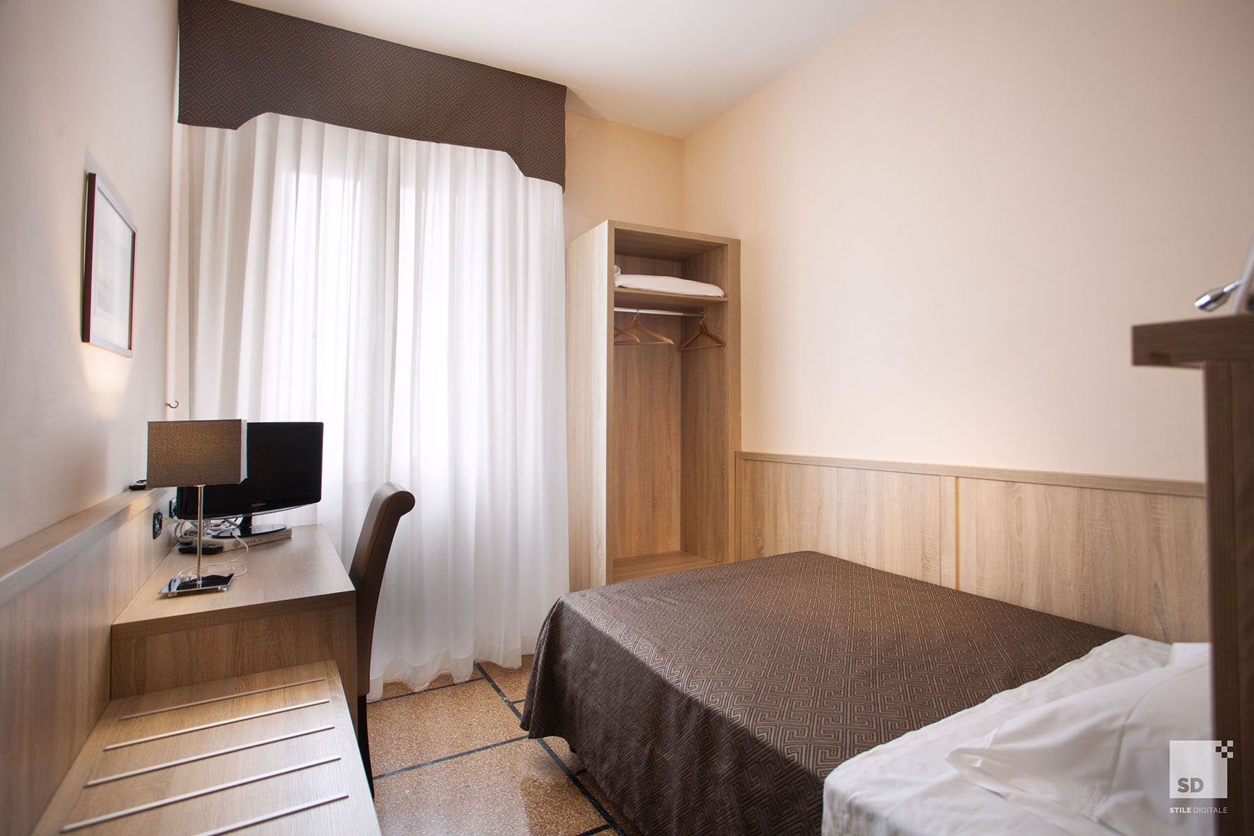 La camera singola ha dimensioni ridotte (11 mq. circa) ed è dotata di un letto francese da 120 x 195cm.