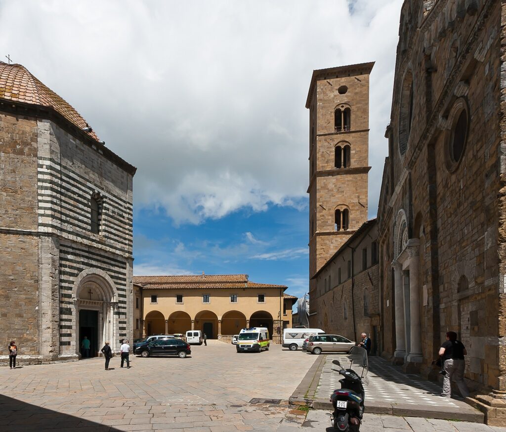 Dopo aver visitato i luoghi del potere temporale è tempo di spostarci verso quelli del potere spirituale: eccoci quindi alla cattedrale di Santa Maria Assunta o Duomo di Volterra, un edificio costruito nel 1117 ampliato nella seconda metà del Duecento e poi rimaneggiato per sei secoli. È costruita con diversi stili: troviamo il romanico nella facciata, il tardo-rinascimentale all’interno con un soffitto a cassettoni dorato, statue e scene sacre dipinte. Il campanile è del XV secolo.