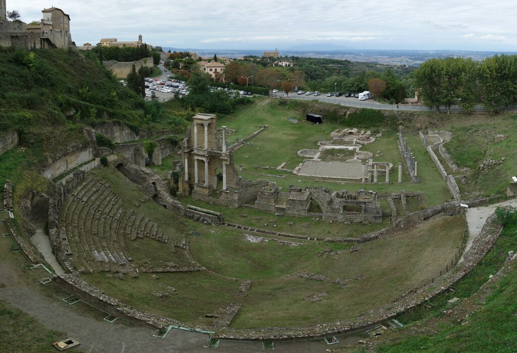 Subito fuori dalla Porta Fiorentina, costruito a ridosso della collina, si trova il teatro romano di Volterra, riportato alla luce negli anni Cinquanta del Novecento. Il teatro è stato datato alla fine del I secolo a.C. e gli scavi hanno riportato alla luce dei sedili e alcune delle scalinate.